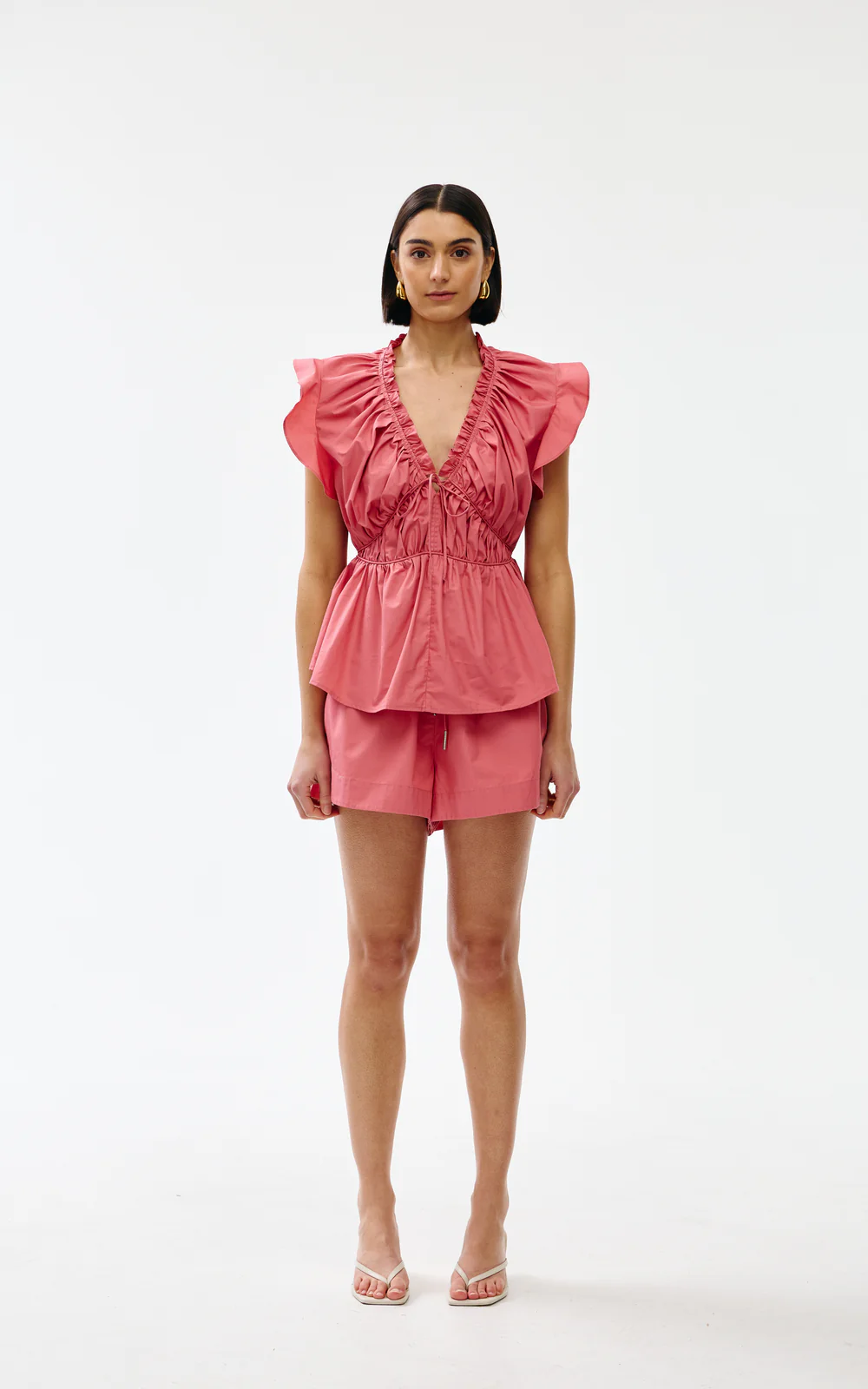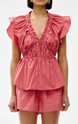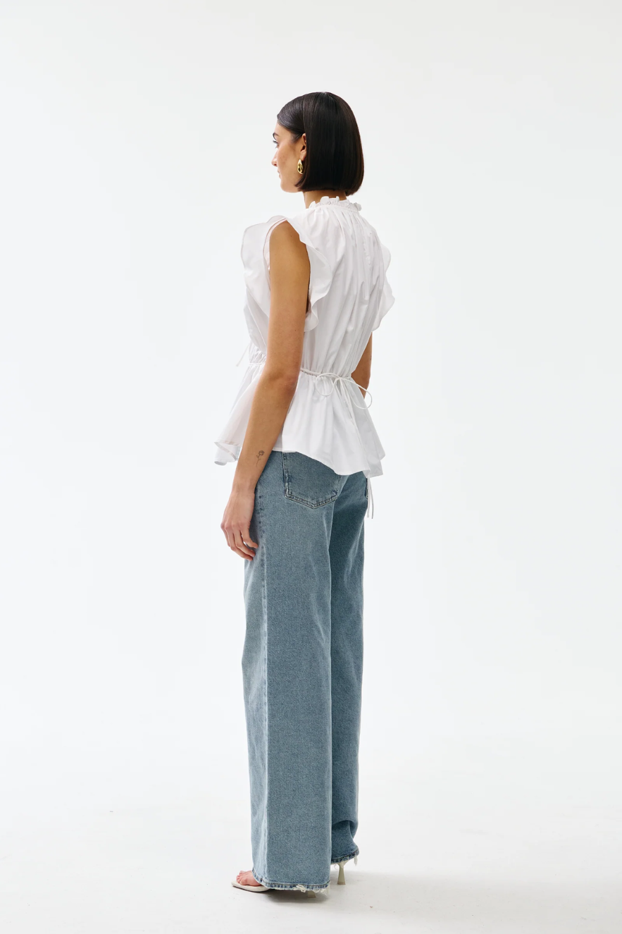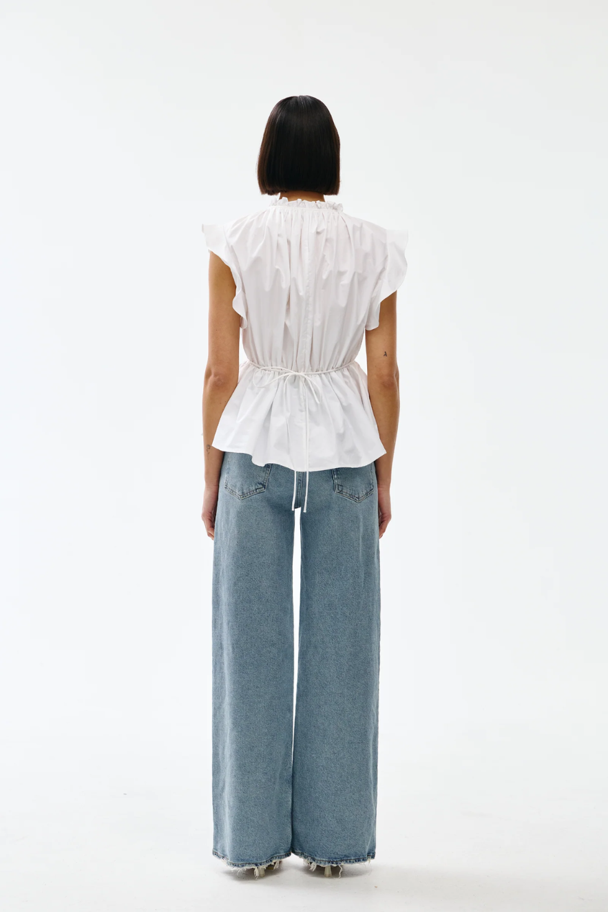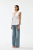 The Bobbie Top in Ivory by Kinney combines romantic detailing with modern versatility. Featuring a flattering V-neckline with ruffle trim and a drawstring waist, this blouse allows you to cinch and define your silhouette. Slightly ruffled sleeves and a peplum hem add a feminine, sophisticated touch, while the crisp 100% cotton fabric keeps the top fresh and structured.
