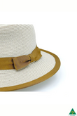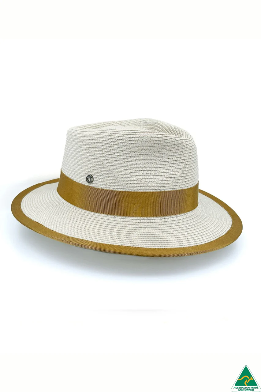 In a crisp ivory hue, this elegant piece is elevated by a distinctive gold ribbon trim that gracefully accents both the crown and the edge of the brim - blending old-world charm with a fresh, fashion-forward twist.