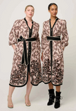 Showcasing an exclusive Russet Palm placement embroidery, the Camille Dress features intricate botanical motifs layered with graphic contrast trims for a bold yet timeless look. The curved hemline creates a flattering, elongated silhouette, while the self-tie waist belt defines the figure with effortless sophistication. A softly structured stand collar and button-through front complete the design, allowing for versatile styling from day to evening.