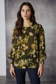 Add a playful elegance to your daytime look with the Lania Celeste long sleeve top cut in a lightweight georgette. Pleat detailing on the yoke with a satin trim on the seam adds a distinctly Lania moment to your outfit. This top features billowing sleeves with an elegant floral print, dramatic shirred cuffs with contrasting embroidery thread detaliing.