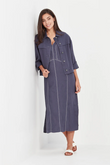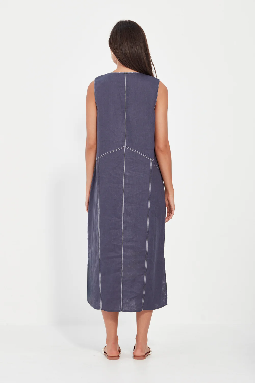 The Verge Cordelia Dress is crafted from 100% linen and designed with effortless sophistication in mind. Featuring a sleeveless V-neckline and contrast topstitching for a refined touch, it’s cut in a straight silhouette that skims the body beautifully. Falling to mid-calf with side splits for comfort and movement, this versatile piece transitions seamlessly from relaxed days to elegant evenings.
