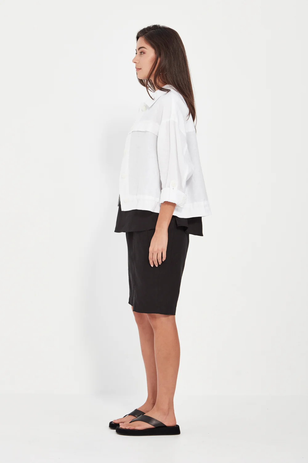 The Verge Echo Jacket is a relaxed utility-inspired style crafted from 100% linen for breathable comfort and effortless wear. Featuring a button-through front, classic collar, and full-length sleeves with adjustable button tabs, it offers versatility and ease. An internal drawcord allows you to define the waist for a more tailored silhouette. Lightweight and timeless, it’s the perfect layering piece—whether styled with linen pants or worn open over your favourite summer dress.