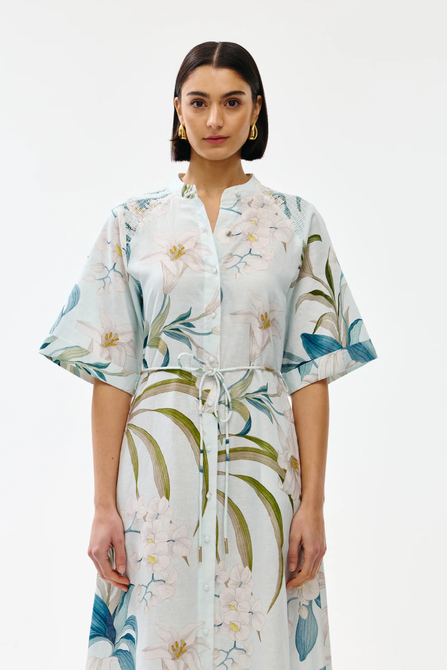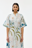 The Gigi Dress in Portofino by Kinney is a celebration of breezy coastal style. Featuring a flowing shirt-style silhouette with a soft botanical print, this dress can be cinched at the waist with a detachable tie for adjustable shape and comfort.