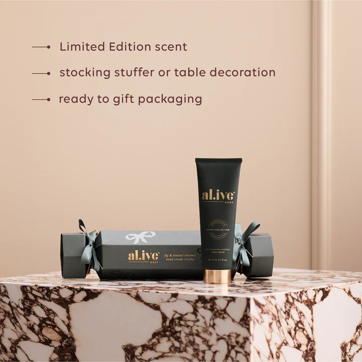 Housed in a festive cracker that doubles as both a charming ornament and the perfect table decoration, the beautifully presented al.ive body Hand Cream Crackers make gifting effortless.