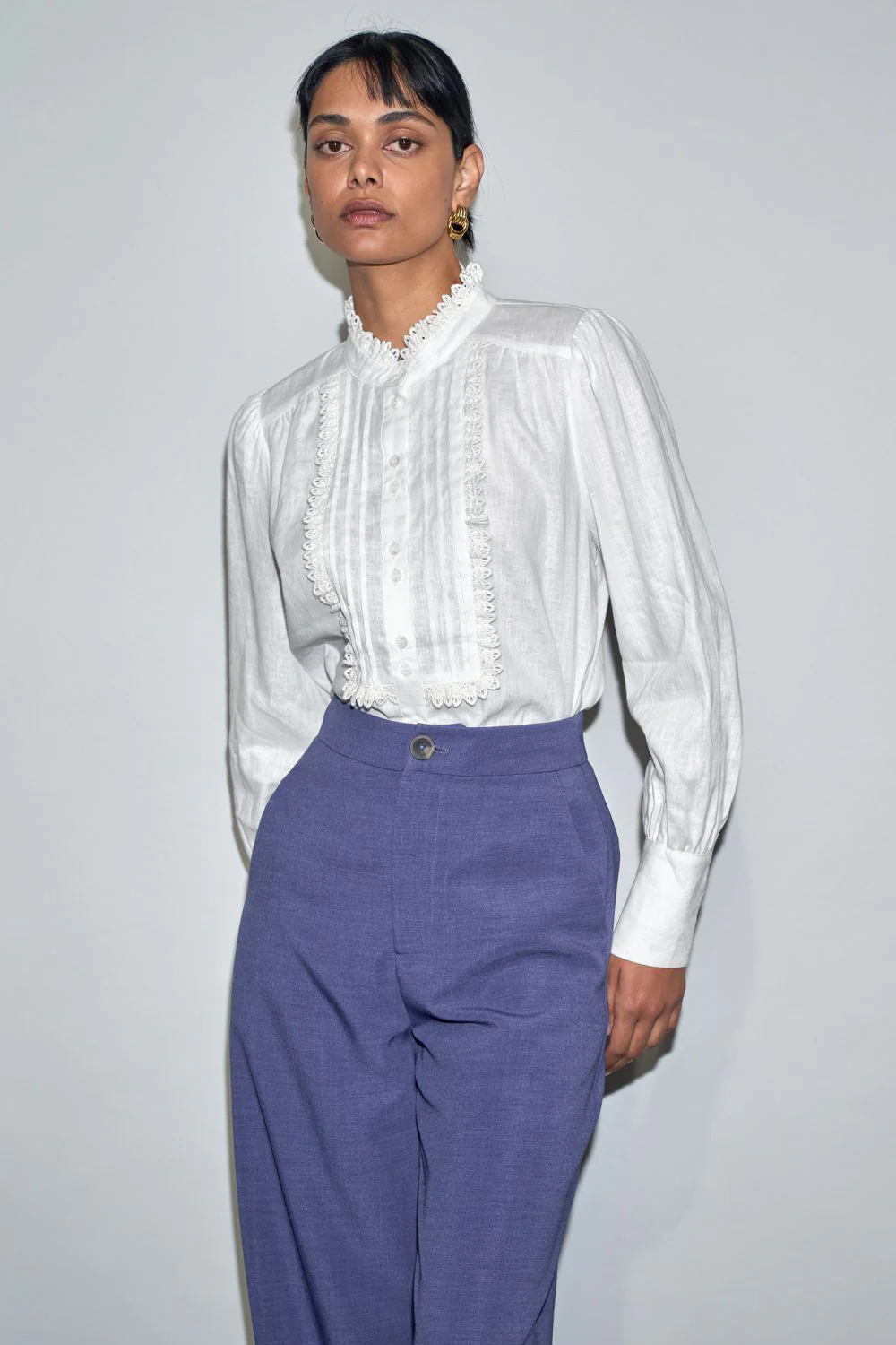 lace-trimmed bib frames the bodice with subtle femininity