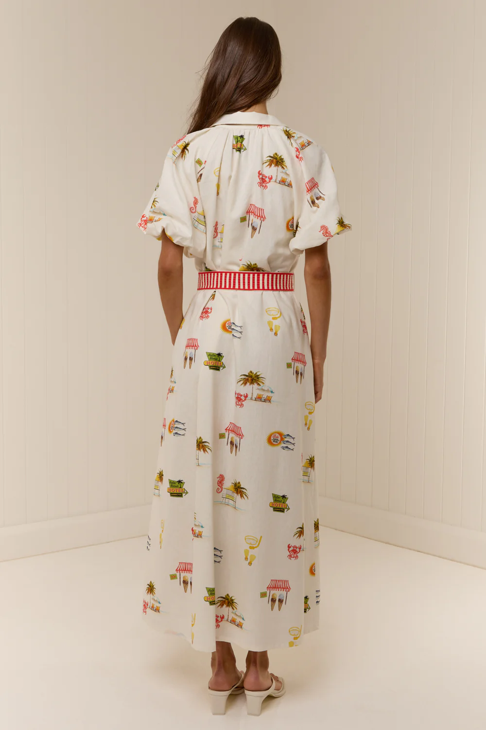 The Palm Noosa Marla Dress is crafted from a premium linen blend, in the exclusive Tropicana print. The Marla dress features a point collar, blouson short sleeves and centre front button detailing, finished with a removable contrast sash belt for a relaxed but elevated fit.