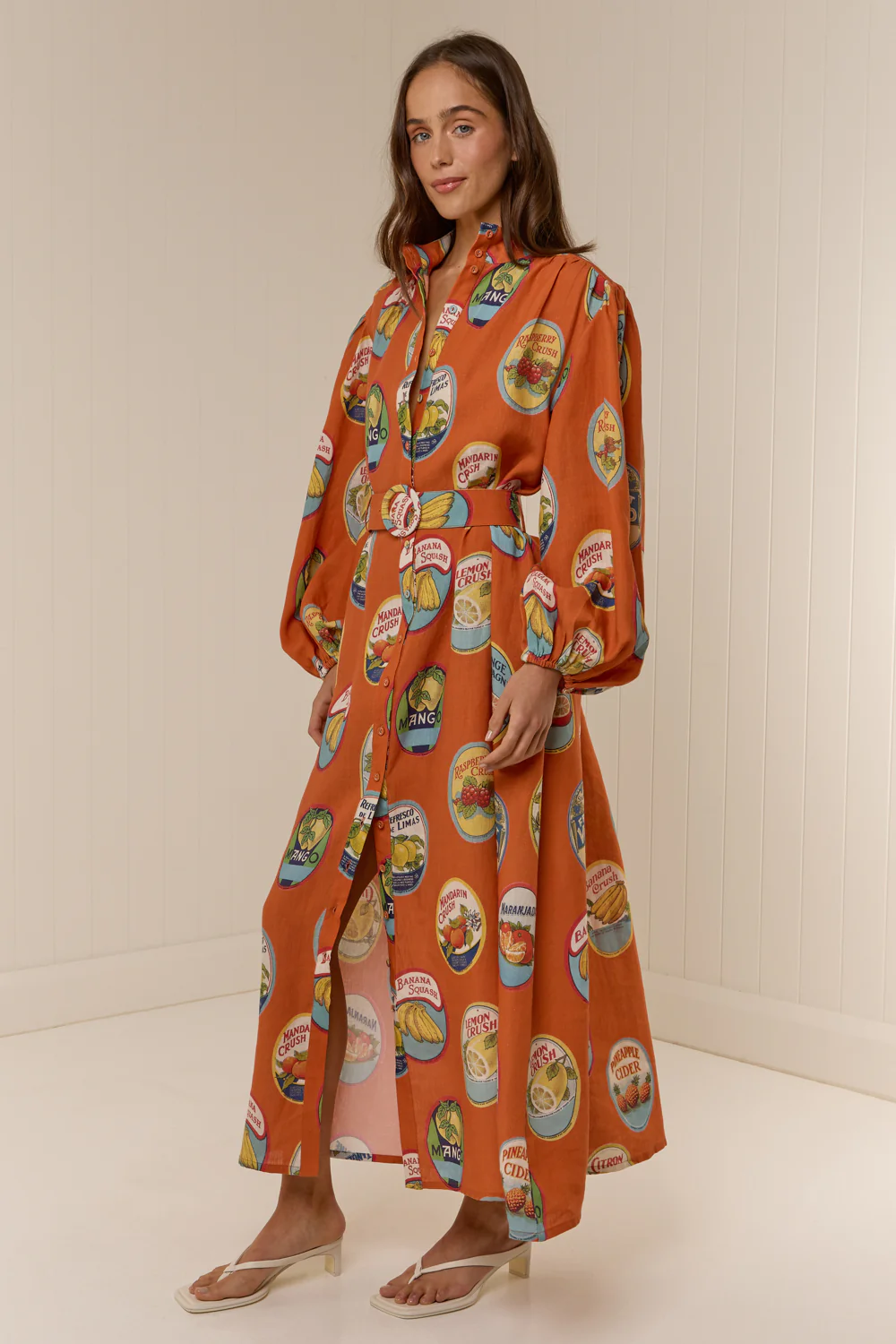 The Noddy Dress is designed as a relaxed maxi dress silhouette. Featuring blouson sleeves with elasticated cuffs and centre front button detailing. Designed to hang loosely from the body, with a matching buckle belt to bring in the waist.