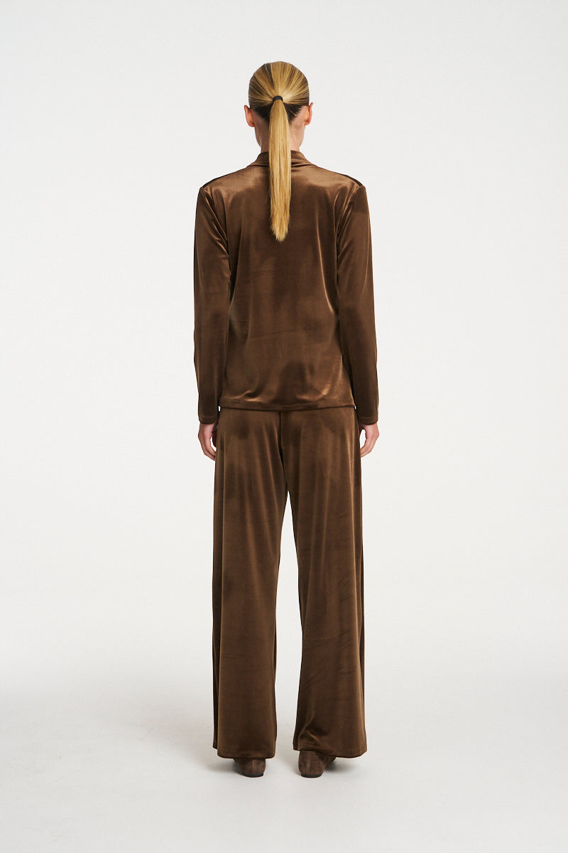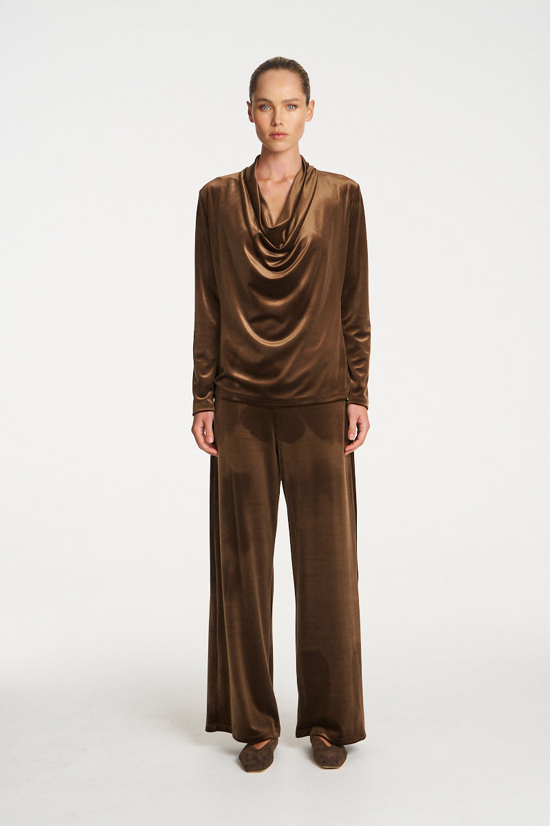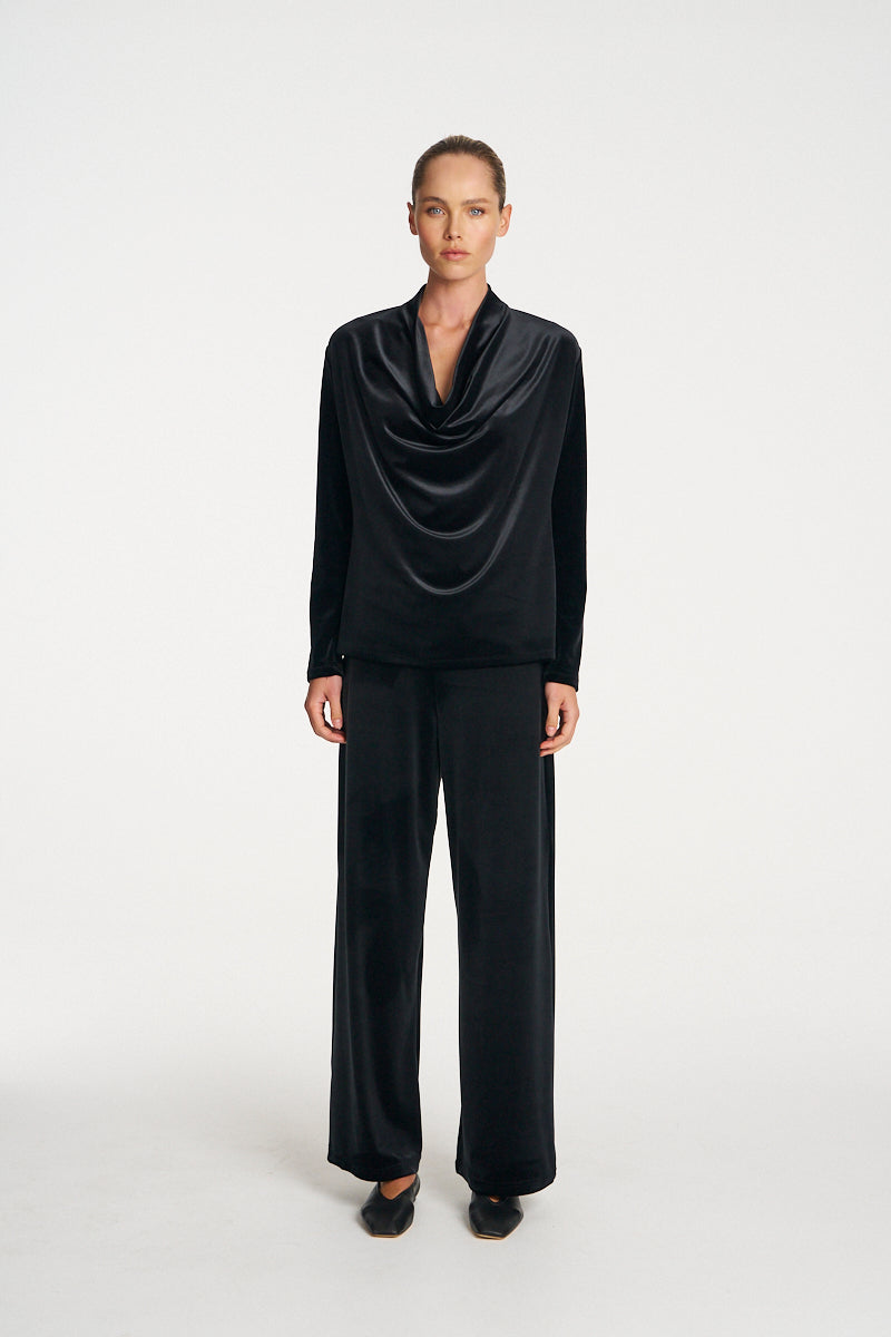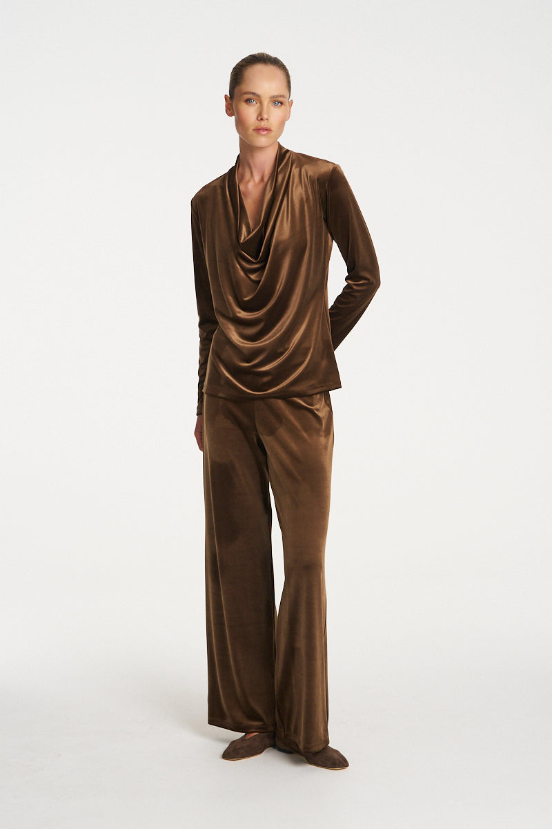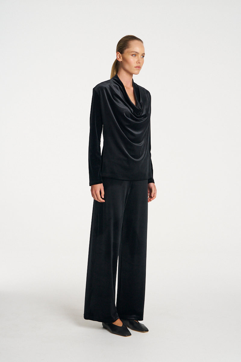 Crafted from Mela Purdie's Stretch Panne, a midweight velvet, featuring a subtle lustre finish. The Palazzo Pant offers a comfortable and flattering wide leg silhouette, featuring an elasticated waistband. An essential pant in a elevated fabrication.