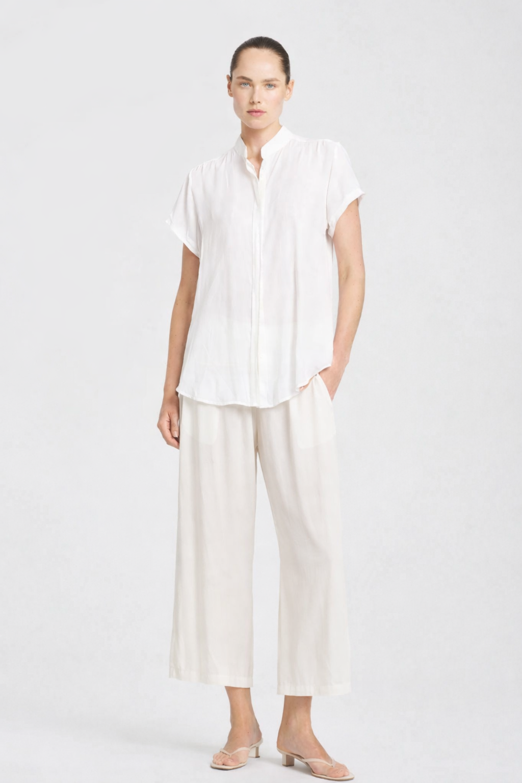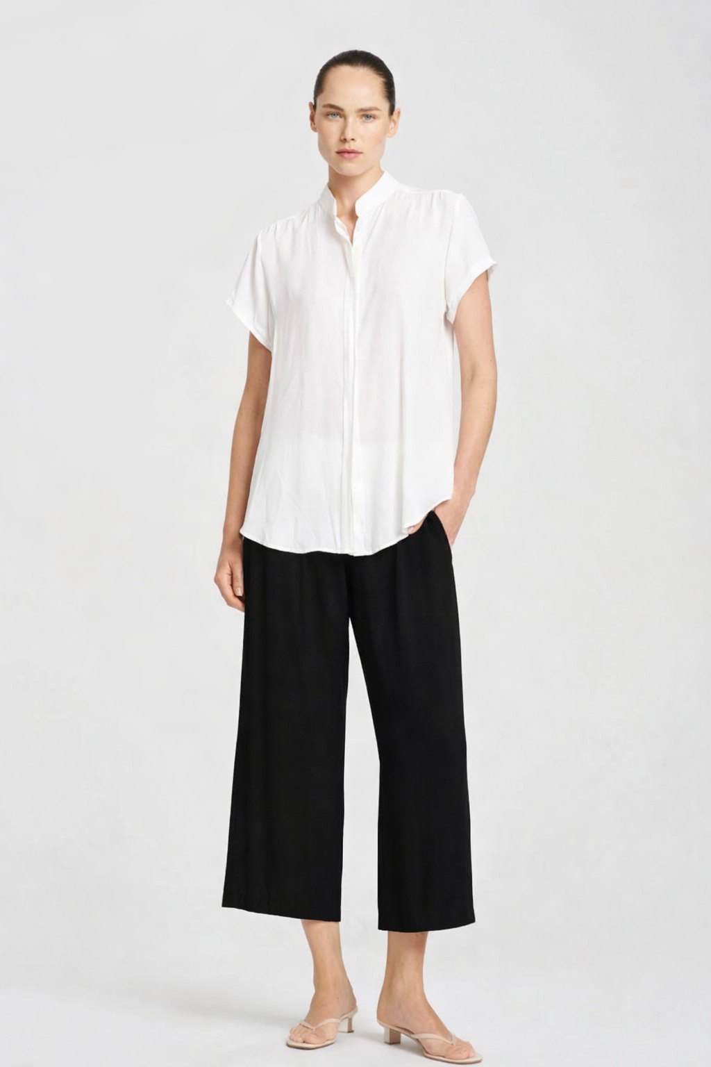 The Mela Purdie Pace Pant highlights a wide leg silhouette in a slightly cropped length. Crafted in Mela Purdie's smooth, airflow finish Mache, these elasticated waist pants allow comfort and fluidity during wear.