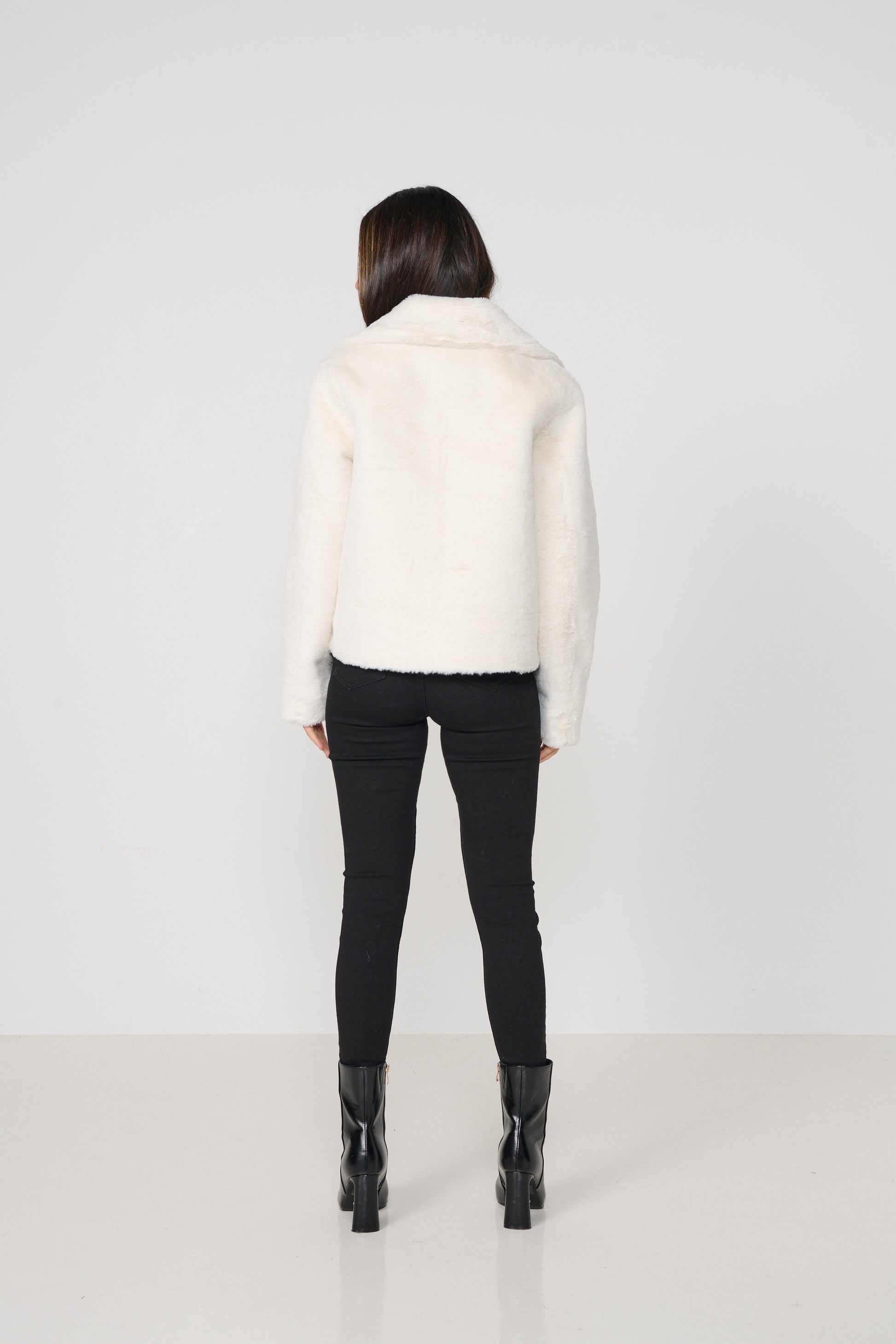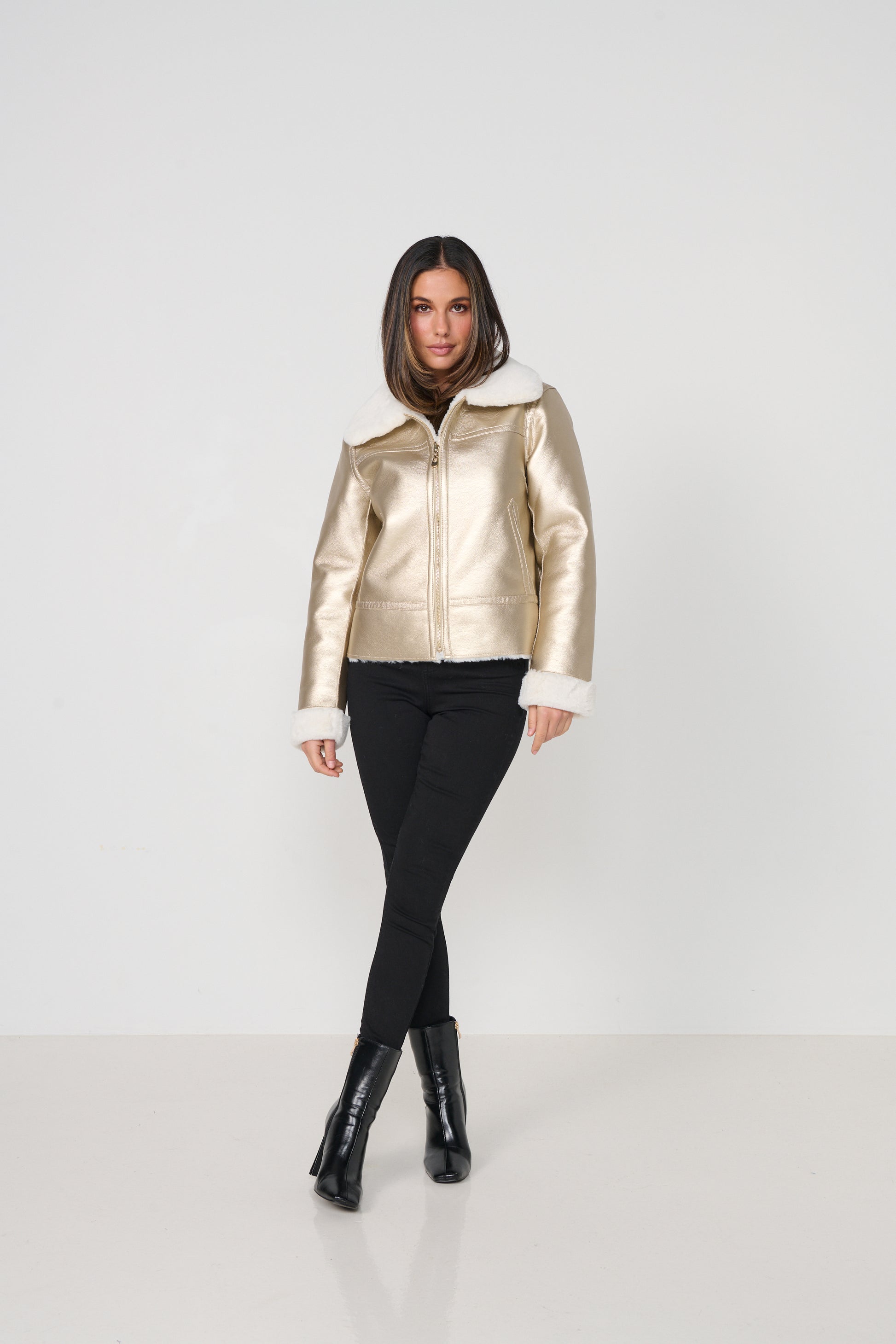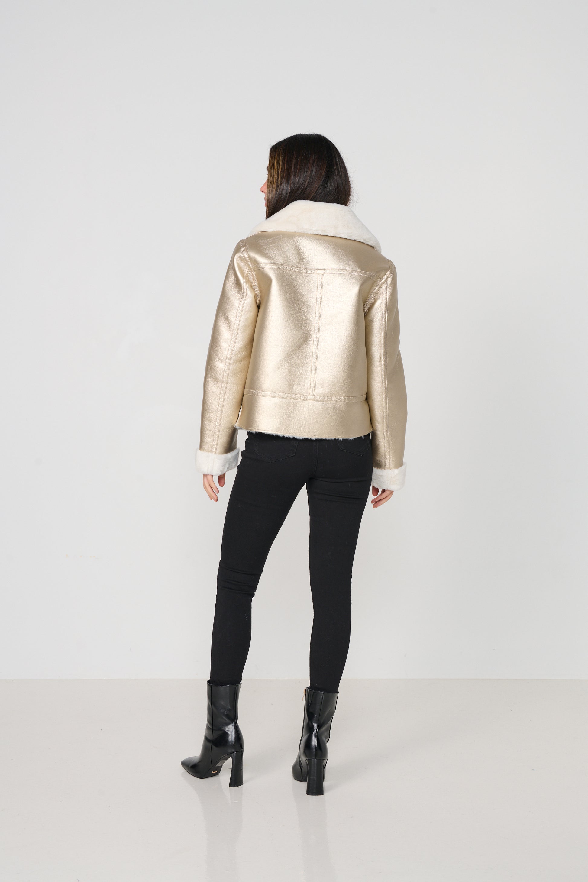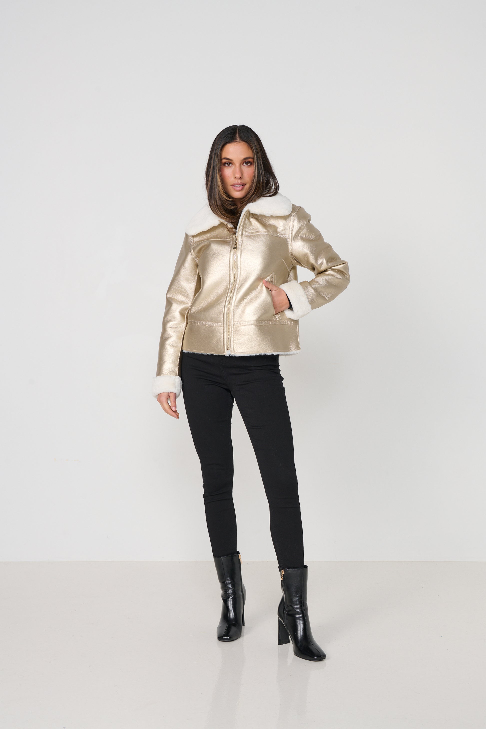 Designed to be worn two ways, it offers the versatility of a sleek gold biker on one side and a soft, cosy fur look on the other. Featuring a statement collar, zip front, and a flattering cropped silhouette, this jacket adds instant polish and warmth to any outfit.