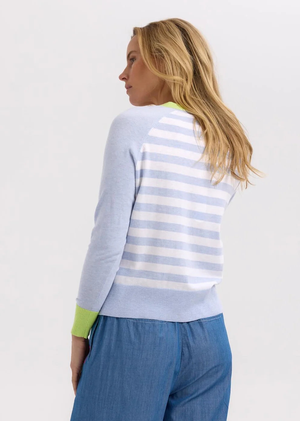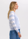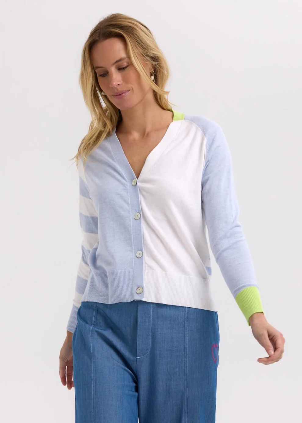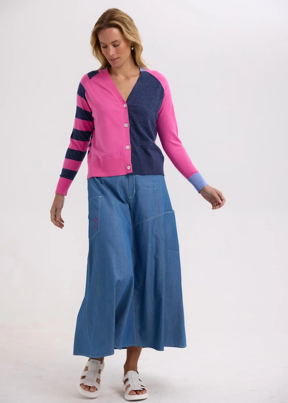 The Split Cardi by Zaket & Plover is a vibrant twist on a best-loved silhouette. Featuring an asymmetrical design with contrasting tones, vertical and horizontal stripes, and standout cuffs, it’s a knit that’s full of personality.