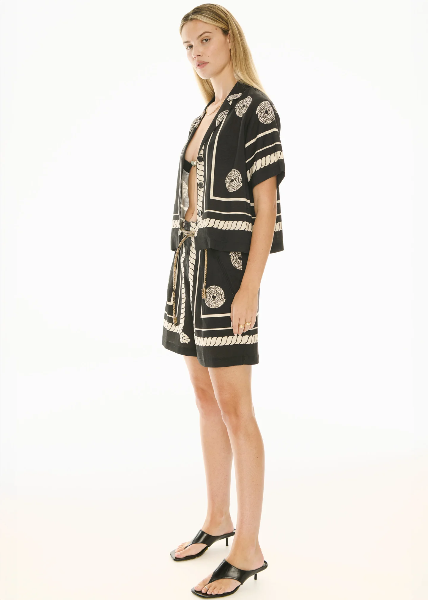 Made from a linen blend featuring an in-house designed Buoy Print, the POL Clothing Tangle Shirt features a scarf style placement print that feels like Summer.