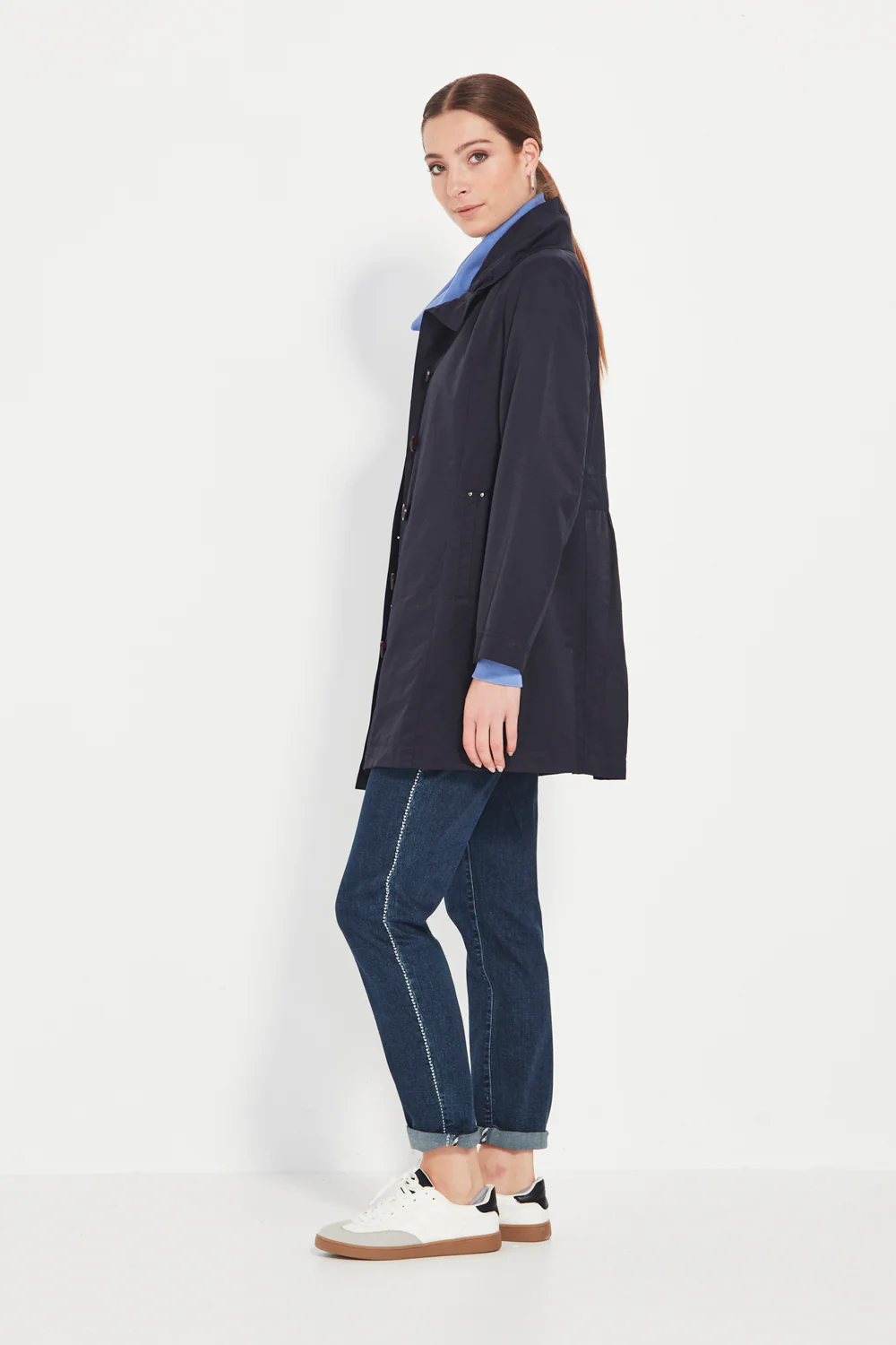 The Verge Tova Coat offers a refined blend of structure and soft volume. The gathered high-neck collar adds gentle shape and warmth, creating a striking neckline that sets this style apart. Functional side pockets with rivet detailing bring a subtle utilitarian touch, while the gathered back panel adds movement and an elegant line through the body.